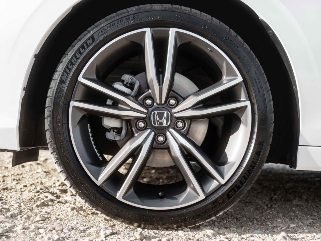 Az első lökhárító hangsúlyosabb vonalvezetésű és karosszéria színű alsó spoilerrel rendelkezik, ami atletikusabb és exkluzívabb megjelenést kölcsönöz az autónak. Az új, 18 colos, kétszínű, gyémántcsiszolt fekete/szürke könnyűfém keréktárcsák az Advance felszereltségi szinten és a matt szürke Sport felszereltségi szinten további dinamikus hatást keltenek a Civic feltűnő külsején, amit a küszöblécek magasfényű fekete felülete egészít ki.